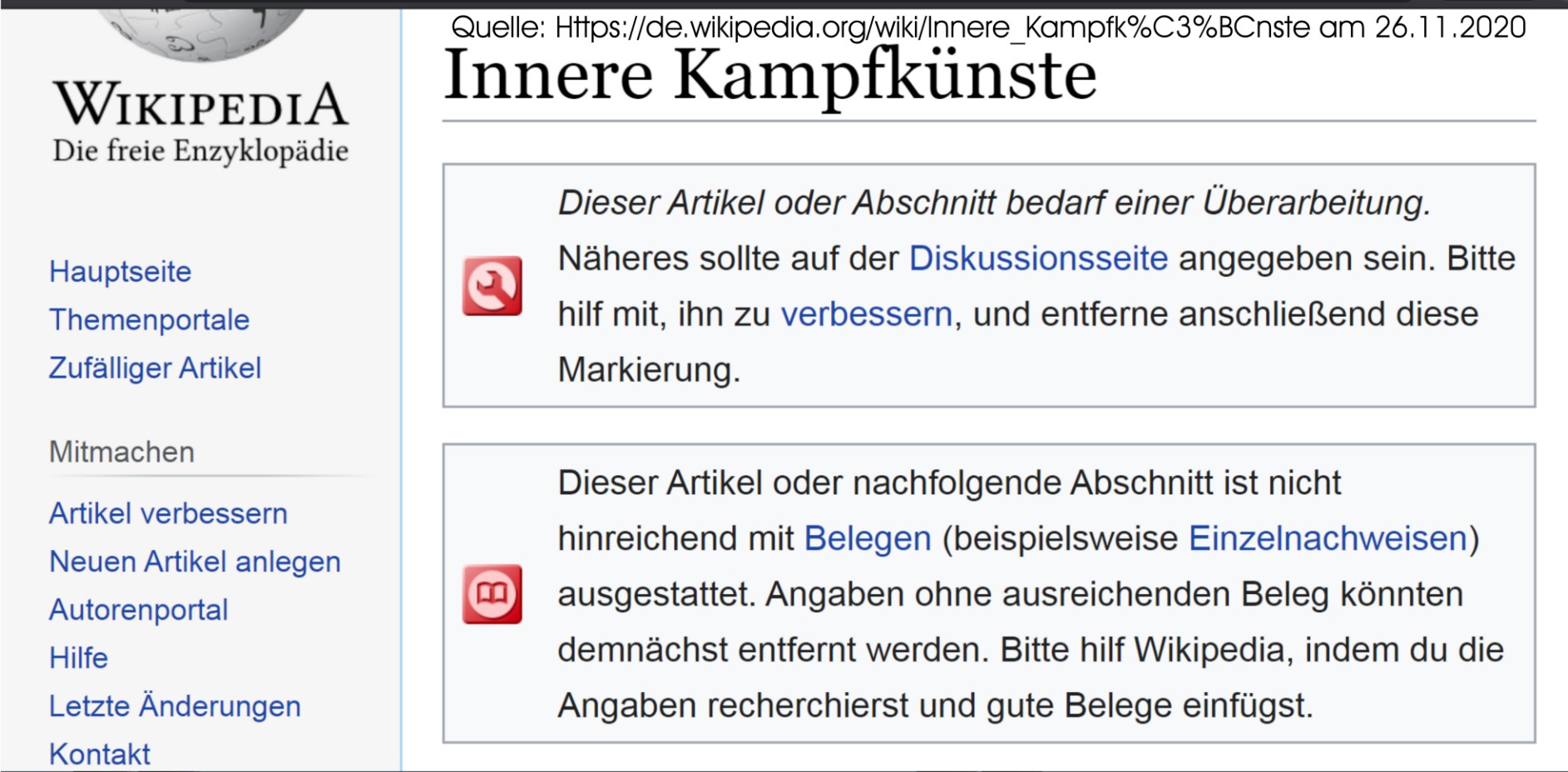 Die Infografik zeigt die Mängel der Wiki-Definition auf. Der "User-generated Content" spannt sozusagen den Karren vor das Pferd. Es ist eine Art "Ad-Hoc-Bastellösung". Diese unzureichende Sicht der Taijiquan-Praktizierenden und deren Spin-Doktoren hat nun Wikipedia selbst als unverifiziert gekennzeichnet. Quelle: Wie definiert man Pushhands / Tuishou? .